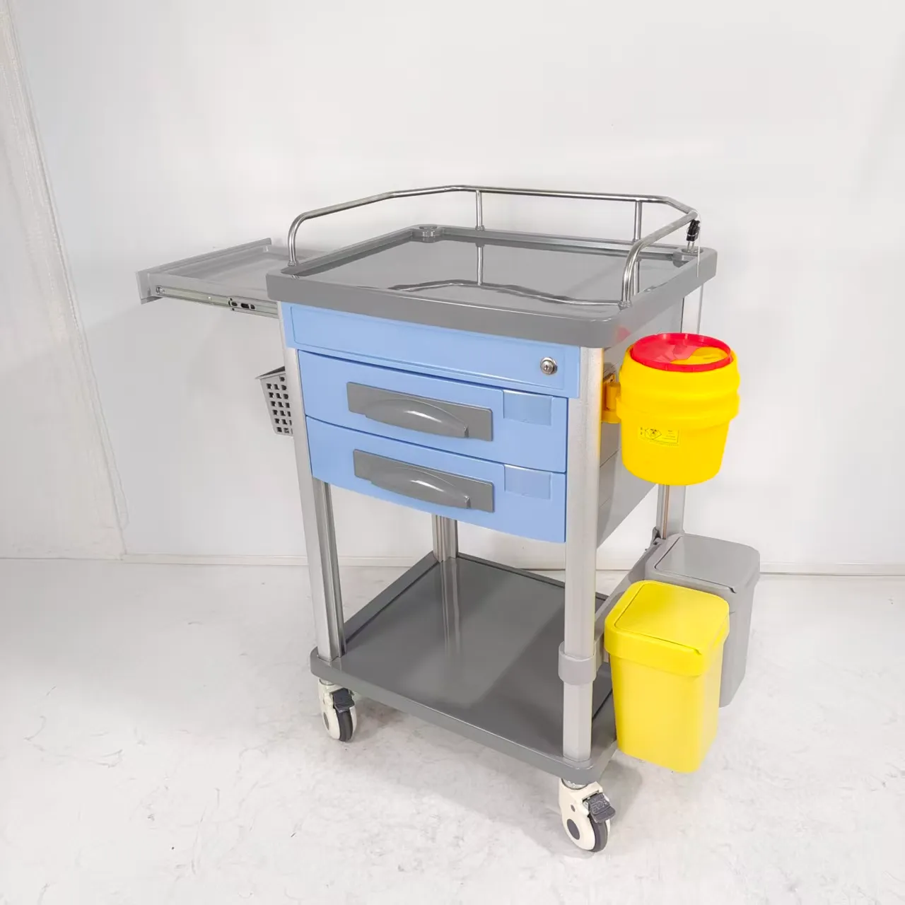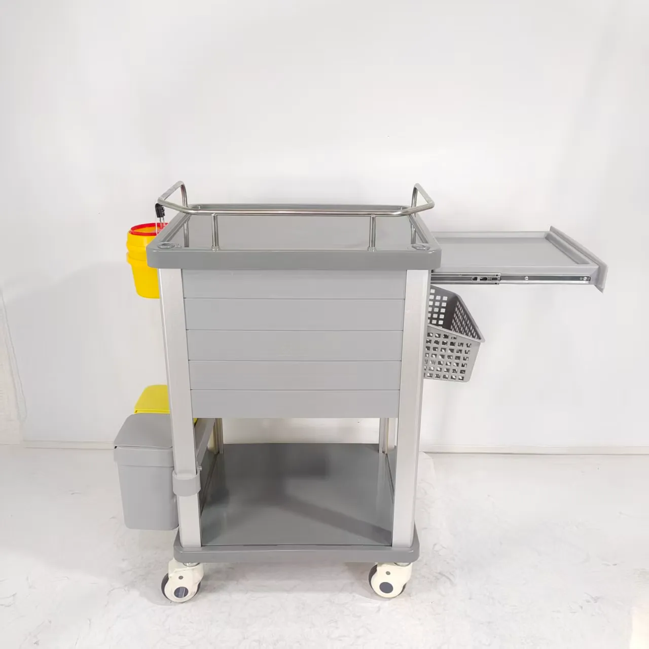 - Dust Basket: The dust basket of the anesthesia cart is designed with a thoughtful and practical approach, incorporating two distinct colors to facilitate the sorting of medical waste. This intuitive design enables efficient segregation of waste materials, contributing to a hygienic and organized environment within healthcare facilities. By utilizing color-coding, healthcare professionals can easily differentiate between different types of waste, ensuring proper disposal practices and compliance with waste management regulations. This feature demonstrates a commitment to promoting a safe and clean working environment, aligning with the high standards of sanitation and waste management in medical settings.