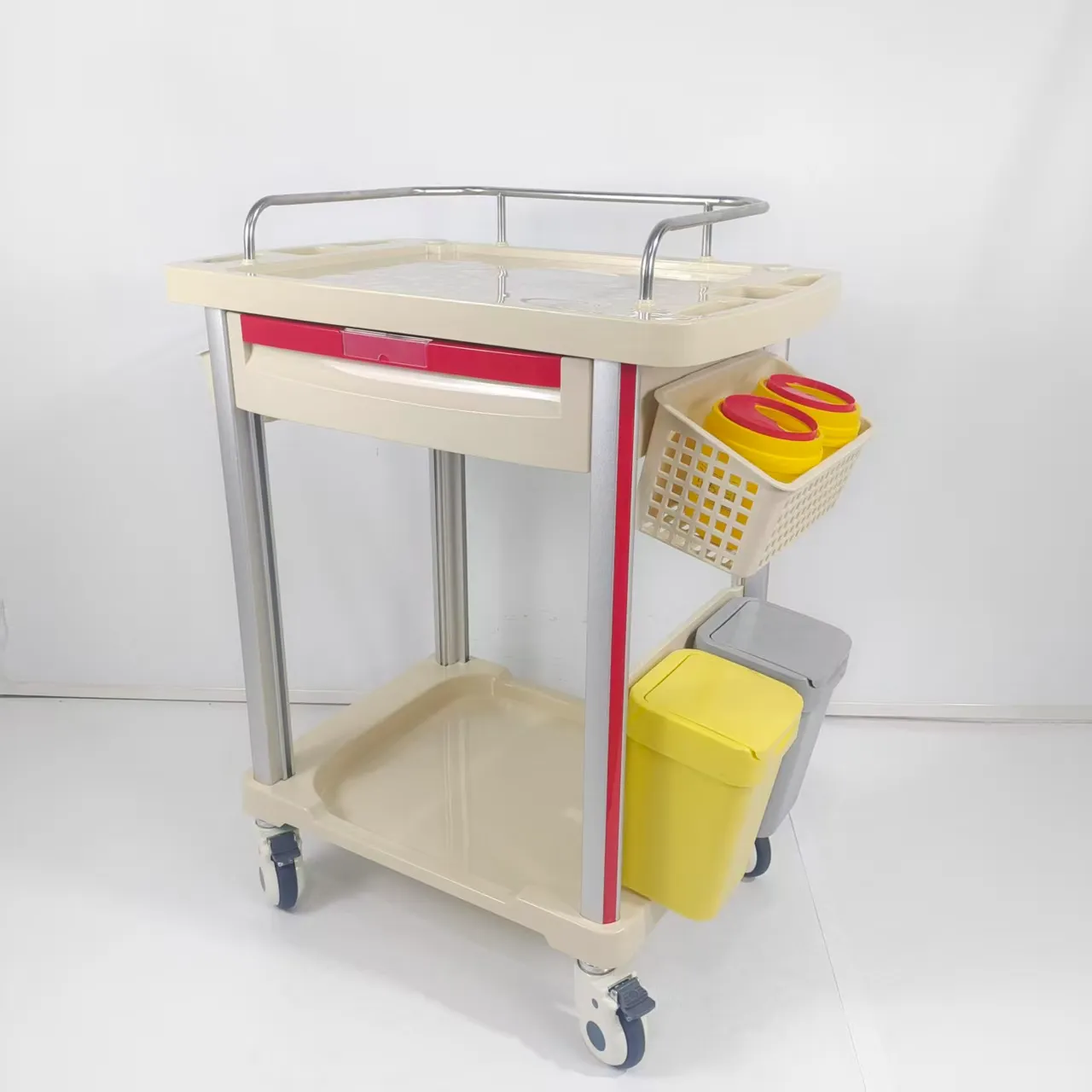 - Dust Basket: The dust basket of the anesthesia cart is designed with a thoughtful and practical approach, incorporating two distinct colors to facilitate the sorting of medical waste. This intuitive design enables efficient segregation of waste materials, contributing to a hygienic and organized environment within healthcare facilities. By utilizing color-coding, healthcare professionals can easily differentiate between different types of waste, ensuring proper disposal practices and compliance with waste management regulations. This feature demonstrates a commitment to promoting a safe and clean working environment, aligning with the high standards of sanitation and waste management in medical settings.