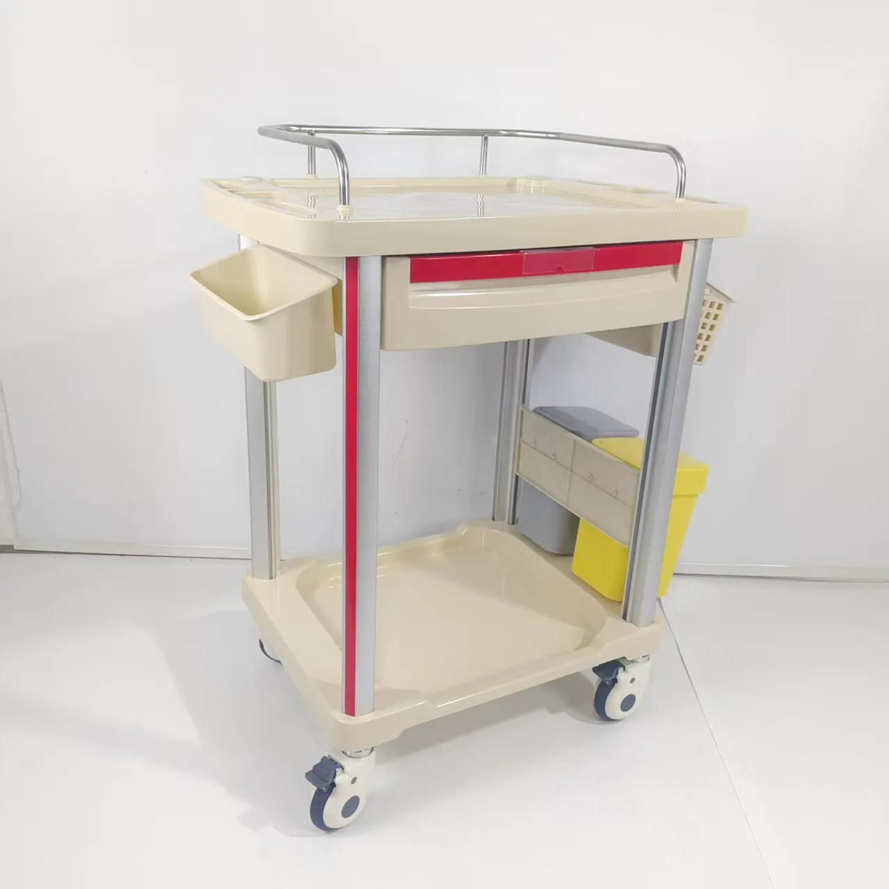 - Construction: The construction of the anesthesia cart is characterized by the implementation of four aluminum alloy metal columns as the main body of the frame, providing exceptional strength and impact resistance, which significantly reduces the likelihood of structural failure. Complementing this robust framework, the main shell components are constructed from ABS material, specifically chosen for its compatibility with disinfection processes, high-temperature resistance, and long-term durability within medical environments. Furthermore, the ABS material offers corrosion resistance, ensuring the longevity and reliability of the anesthesia cart in demanding healthcare settings, ultimately contributing to a safer and more efficient workflow for medical professionals.