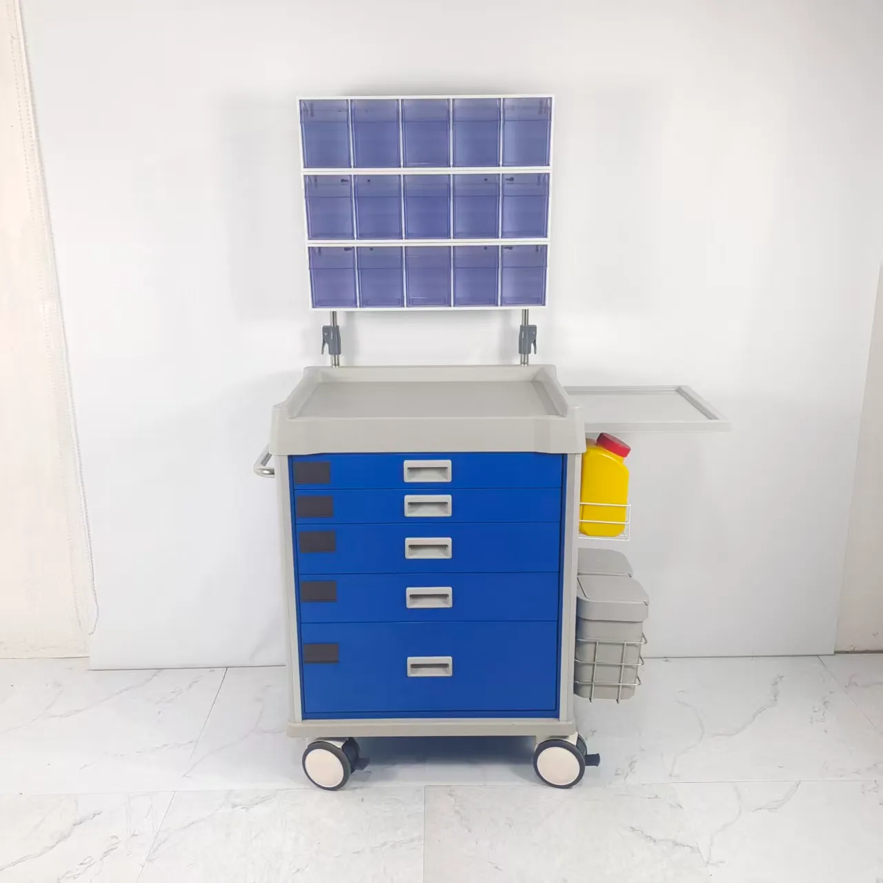 - Drawer with Label Card: The inclusion of two small, two medium, and one large drawer offers diversified storage capacities to accommodate a variety of medical instruments and supplies. The custom-sized dividers within the drawers enable the segregation of items based on size, category, or frequency of use, promoting systematic organization and easy access. Additionally, the provision for inserting information in the form of a plastic plate within the housing part of the drawers allows for clear labeling, ensuring efficient inventory management and quick identification of contents, ultimately contributing to the smooth operation of medical procedures and patient care.