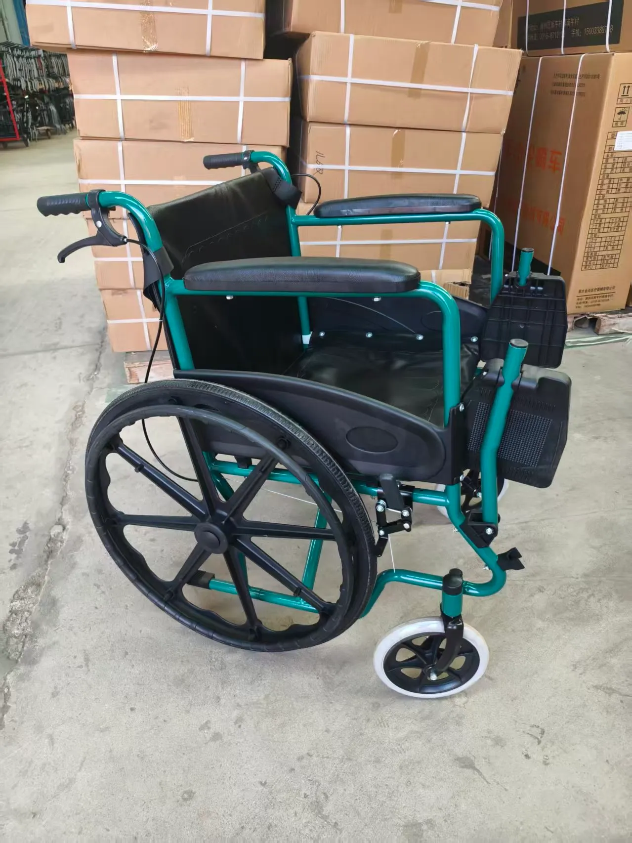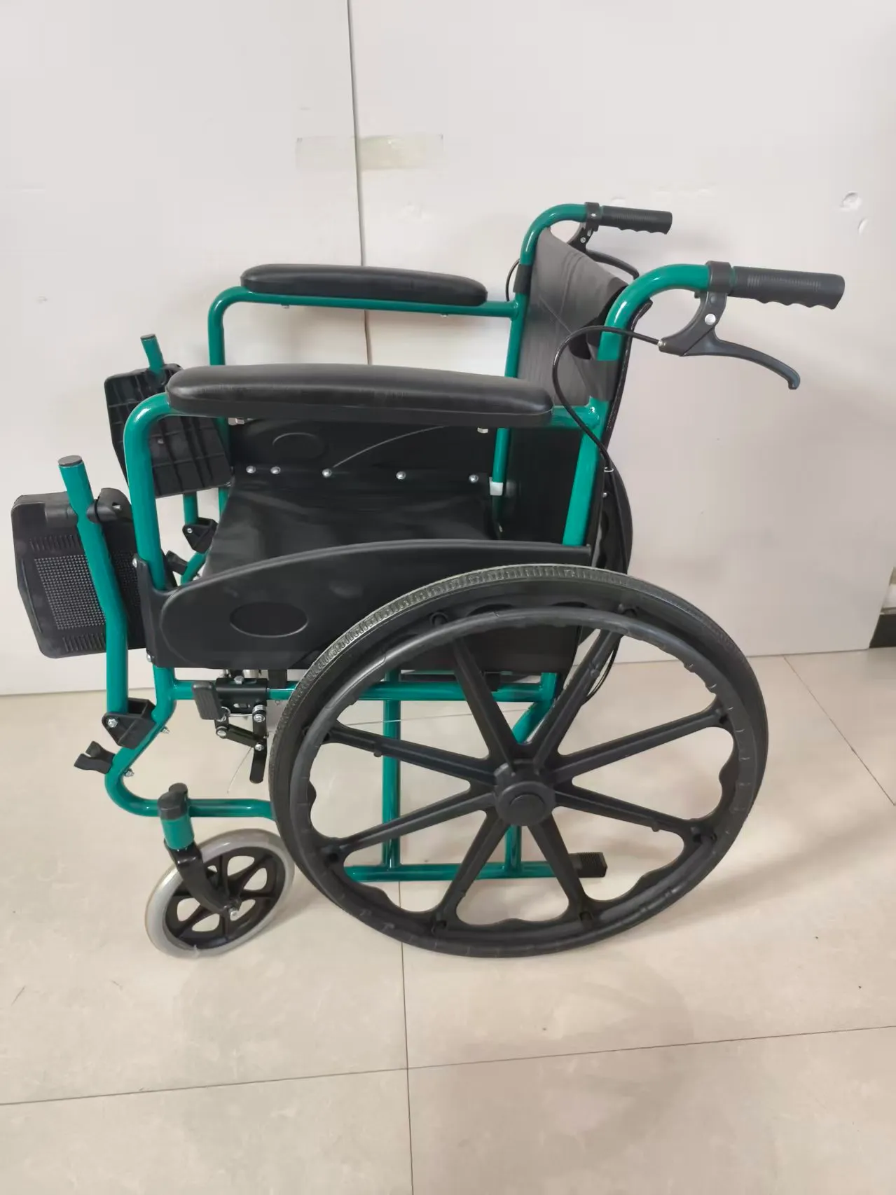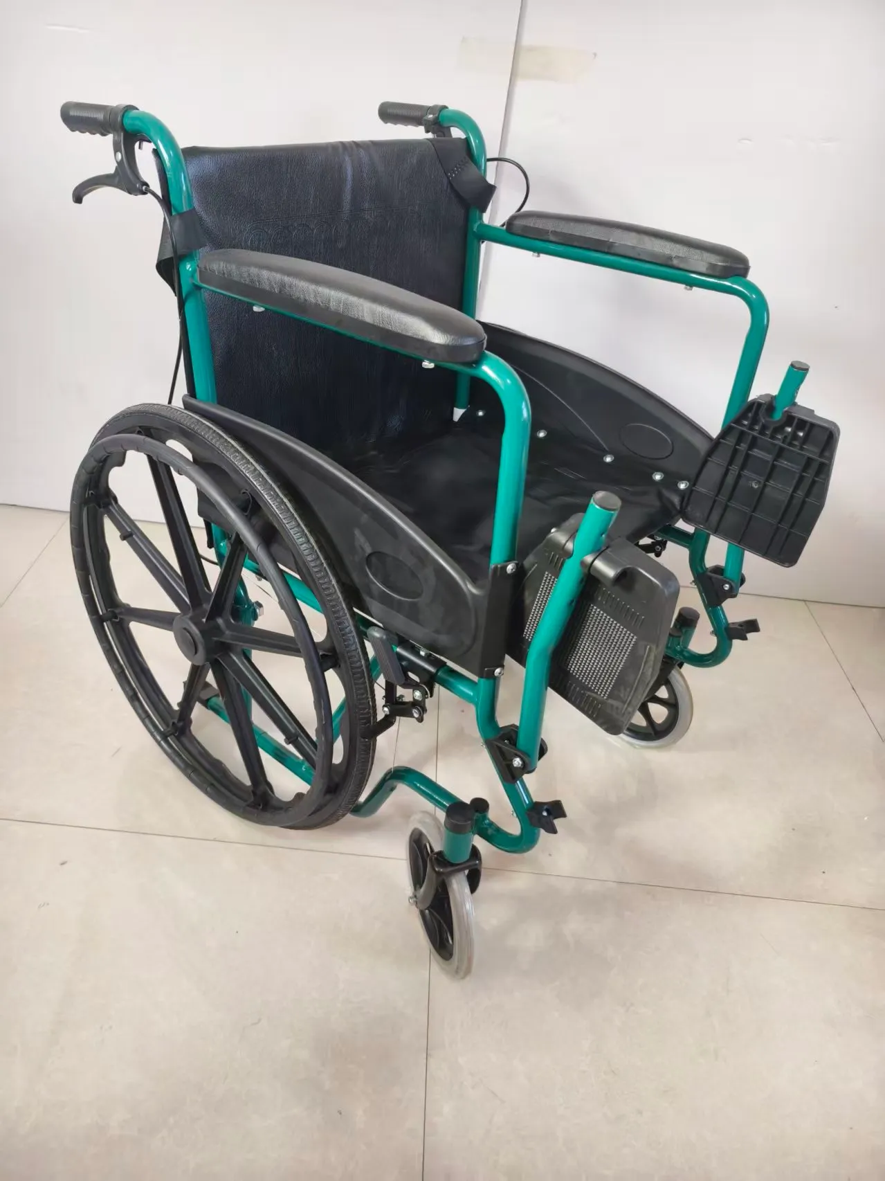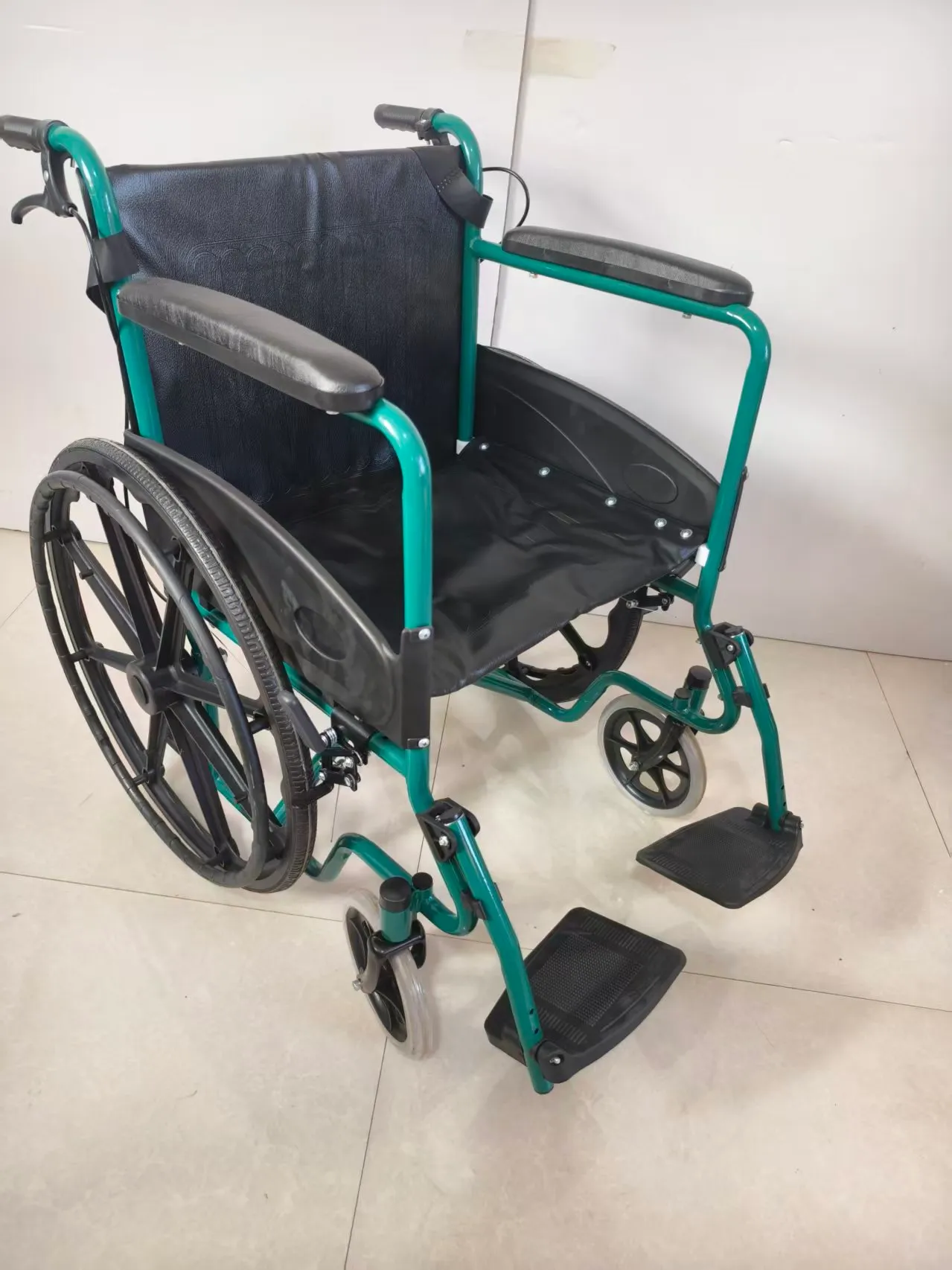 Front wheel: 8-inch (20cm) grey solid wheel Rear wheel: 24-inch (60cm) black solid tire integrated wheel Brake: Dual brake design, two parking brakes at the bottom; Features: High-quality semi-circular plastic guard with high-quality thick sponge leather soft handrails, green frame with single crossbar support structure;
